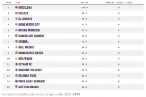 在女子球隊(duì)排名中,巴塞羅那以滿分100分位居榜首,緊隨其后的是切爾西(96.7分)和里昂(96.0分)。曼徹斯特城(93.9分)和拜仁慕尼黑(93.1分)分別排在第四和第五位?;始荫R德里女子隊(duì)以90.6分排名第八,超過(guò)了眾多歐洲傳統(tǒng)強(qiáng)隊(duì),這標(biāo)志著她們正式進(jìn)入國(guó)際頂級(jí)行列。