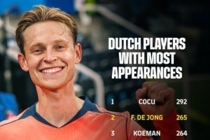 據(jù)巴薩官方數(shù)據(jù)統(tǒng)計,弗蘭基-德容為巴薩出戰(zhàn)場次已經達到265場,超越羅納德-科曼,成為代表巴薩出戰(zhàn)場次第二多的荷蘭球員,僅次于292場的科庫。