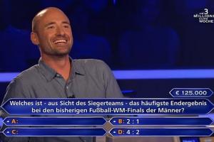 體育資訊10月11日訊 在德國版的《誰想成為百萬富翁》智力競賽節(jié)目中,一位參賽者沒能回答對世界杯決賽的比分,錯(cuò)失12.5萬歐元(約103萬人民幣)獎(jiǎng)金。