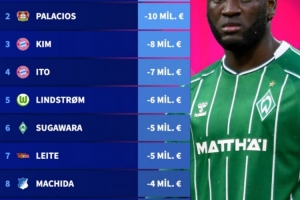 2、帕拉西奧斯(勒沃庫(kù)森):-1000萬歐元