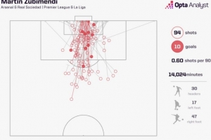 據(jù)統(tǒng)計(jì),這是蘇維門迪在頂級聯(lián)賽生涯首次打進(jìn)禁區(qū)外的遠(yuǎn)射,他在為皇家社會和阿森納效力的比賽中94次射門打進(jìn)10球,但是首次打進(jìn)遠(yuǎn)射。