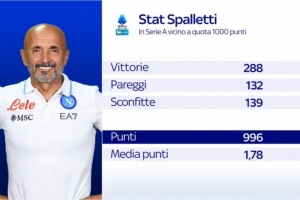 數(shù)據(jù)統(tǒng)計(jì)顯示,斯帕萊蒂共計(jì)在意甲取得288勝、132平、139負(fù),總積分996分、場(chǎng)均積分1.78分。