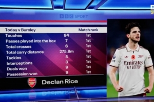 體育資訊11月2日訊 英超第10輪比賽,賴斯破門,阿森納客場(chǎng)2-0擊敗伯恩利,據(jù)BBC統(tǒng)計(jì),此役賴斯觸球、搶斷、攔截等多項(xiàng)數(shù)據(jù)全場(chǎng)居首。