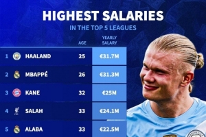 五大聯(lián)賽年薪排名:哈蘭德3170萬(wàn)歐居首,姆巴佩、凱恩二三位