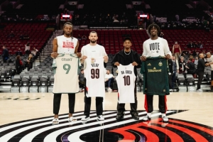 體育資訊11月4日訊 美職聯(lián)波特蘭伐木工隊(duì)球員大衛(wèi)-達(dá)-科斯塔、維爾德在美職聯(lián)季后賽間隙到主場(chǎng)支持開拓者。球隊(duì)也由格蘭特、西索科做代表送出了定制球衣。