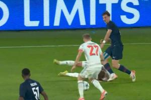 體育資訊11月05日訊 歐冠聯(lián)賽階段第4輪,巴黎對(duì)陣拜仁。44分鐘,基米希爭搶中倒地,隨后頭部被法比安踢到,裁判沒有表示。