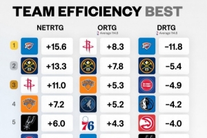 體育資訊11月14日訊 美媒Basketball University發(fā)布了賽季至今的各隊凈效率、進(jìn)攻效率以及防守效率前十的幫當(dāng)。其中雷霆凈效率+15.6排名第一,進(jìn)攻效率火箭+8.3排名第一,防守效率雷霆-11.8排名第一。