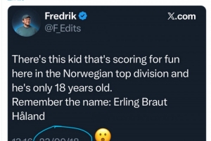 2018年9月23日,記者Fredrik在社交媒體上寫道:“挪威頂級聯(lián)賽有一個(gè)少年,進(jìn)球如同探囊取物,而他只有18歲。請記住這個(gè)名字——埃爾林·布賴于特-哈蘭德?!?/p>