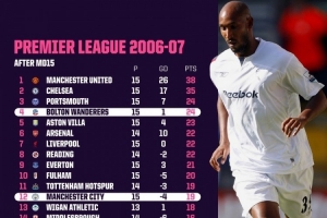 opta列出上一次英超聯(lián)賽第15輪結(jié)束后,第4和第12之間的積分差距不超過5分時(shí)的積分榜。06-07賽季英超15輪過后,第4博爾頓24分,第12曼城19分,兩隊(duì)相差5分。