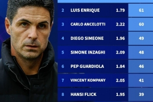 體育資訊12月11日訊 在本輪歐冠,阿森納3-0大勝布魯日,豪取6連勝。德轉(zhuǎn)也盤點(diǎn)了自阿爾特塔執(zhí)教阿森納歐冠首秀以來(lái),各位主帥在歐冠同期積分榜(包括淘汰賽),具體如下(場(chǎng)均積分+總積分):