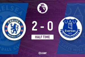 上半場傷停補時3分鐘,半場結束,切爾西暫2-0埃弗頓。