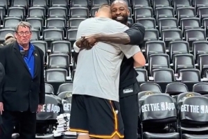 GIF-約基奇賽前和杰夫·格林擁抱熱聊