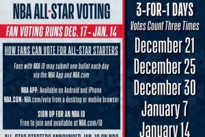 三倍投票日為:12月22日、12月26日、12月31日、1月8日、1月15日,全明星首發(fā)名單將于1月20日在NBC公布!