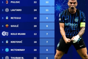 8.小圖拉姆(國米)、萊奧(米蘭)、奧爾索里尼(博洛尼亞) 21場進6球