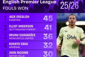 體育資訊12月19日訊 數(shù)據(jù)機(jī)構(gòu)squawka統(tǒng)計(jì)了本賽季英超造犯規(guī)次數(shù)榜,被曼城外租的格拉利什居首。