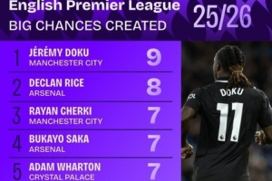 本賽季英超運動戰(zhàn)創(chuàng)造重大機會榜: