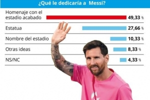 27.66%的球迷支持在球場(chǎng)外為其樹(shù)立雕像,使其與克魯伊夫和庫(kù)巴拉并列。僅有10.33%的人贊同直接將球場(chǎng)更名為“里奧·梅西球場(chǎng)”。