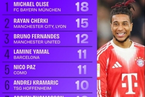 體育資訊12月31日訊 數(shù)據(jù)網(wǎng)站Squawka盤點(diǎn)了2025年五大聯(lián)賽助攻榜,其中拜仁球員奧利塞居首,具體如下: