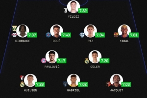 前衛(wèi):揚·迪奧曼德(萊加內斯、萊比錫,7.37分)、杜埃(巴黎,7.40分)、帕斯(科莫,7.34分)、亞馬爾(巴薩,7.81分)