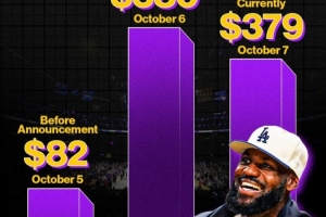 體育資訊10月8日訊 根據(jù)二手票務(wù)平臺的報道,在詹姆斯發(fā)布“決定二”預(yù)告前,湖人新賽季最后一個主場最便宜的票價為82美元。而隨著詹姆斯發(fā)布預(yù)告,最低票價上漲到580美元。