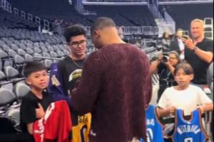 體育資訊10月20日訊 美媒昨日曬出視頻,威少為小球迷們簽名,簽了雷霆與火箭的,唯獨(dú)略過了湖人的。