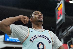 上半場,馬刺兩位球員凱爾登·約翰遜和??怂咕谐錾l(fā)揮,凱爾登15分鐘9投7中,三分5中3、罰球1中1拿到18分5籃板2助攻,正負(fù)值+14;