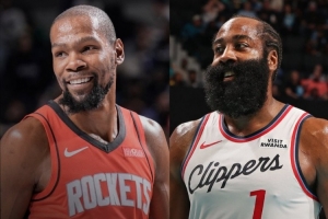 比賽過程中,火箭隨隊(duì)記者Jackson Gatlin發(fā)推寫道:“看到凱文·杜蘭特身穿火箭球衣對(duì)陣身披快船戰(zhàn)袍的詹姆斯·哈登,感覺真是奇怪?!?/p>