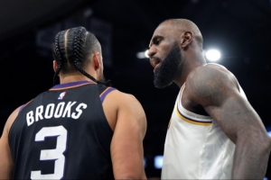 考慮到布魯克斯上次交手后針對(duì)勒布朗和湖人發(fā)表的言論,你本該預(yù)料到?jīng)_突會(huì)很早發(fā)生。通常情況下勒布朗會(huì)無(wú)視布魯克斯,但這個(gè)周日非比尋常,沖突在上半場(chǎng)升級(jí),導(dǎo)致勒布朗在對(duì)位布魯克斯時(shí)領(lǐng)到了一次進(jìn)攻犯規(guī)。