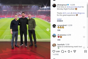 吉魯參與了曼聯(lián)vs伯恩茅斯比賽的解說工作,擔(dān)任評(píng)論嘉賓,他在社交媒體上曬出與卡拉格、大衛(wèi)·瓊斯的合照,配文:“首次參加天空體育的周一足球夜節(jié)目,感謝卡拉格和大衛(wèi)·瓊斯讓我擁有這次美妙的體驗(yàn)。”