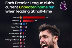英超球隊主場半場領先全場連續(xù)不敗場次: