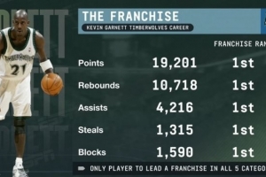 以上5項(xiàng)數(shù)據(jù)全部隊(duì)史第一,加內(nèi)特為NBA歷史唯一