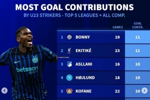 本賽季五大聯(lián)賽U23前鋒各項(xiàng)賽事參與進(jìn)球榜: